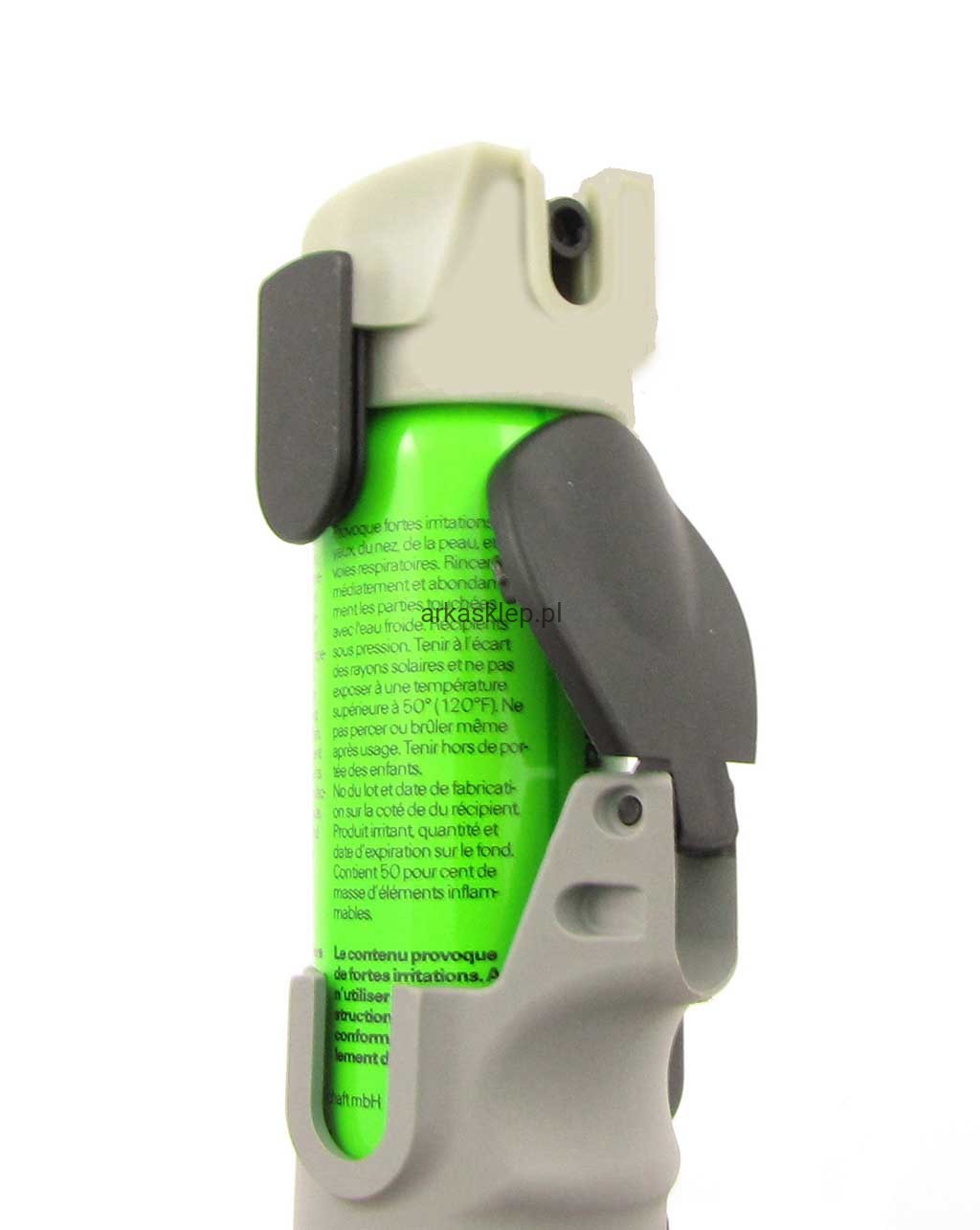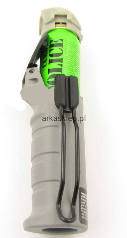 Ręczny miotacz gazu RSG 3/2000 posiada praktyczny metalowy klips umożliwiający bezpośrednie przypięcie gazu do paska.