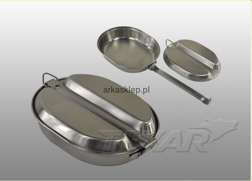 Stalowa menażka firmy Texar, to2-częściowy zestaw garnków, który sprawdzi się na każdym biwaku. . Całość wykonana ze stali nierdzewnej, której grubość pozwala na gotowania bezpośrednio na ogniu, bez ryzyka spalenia naczyń.