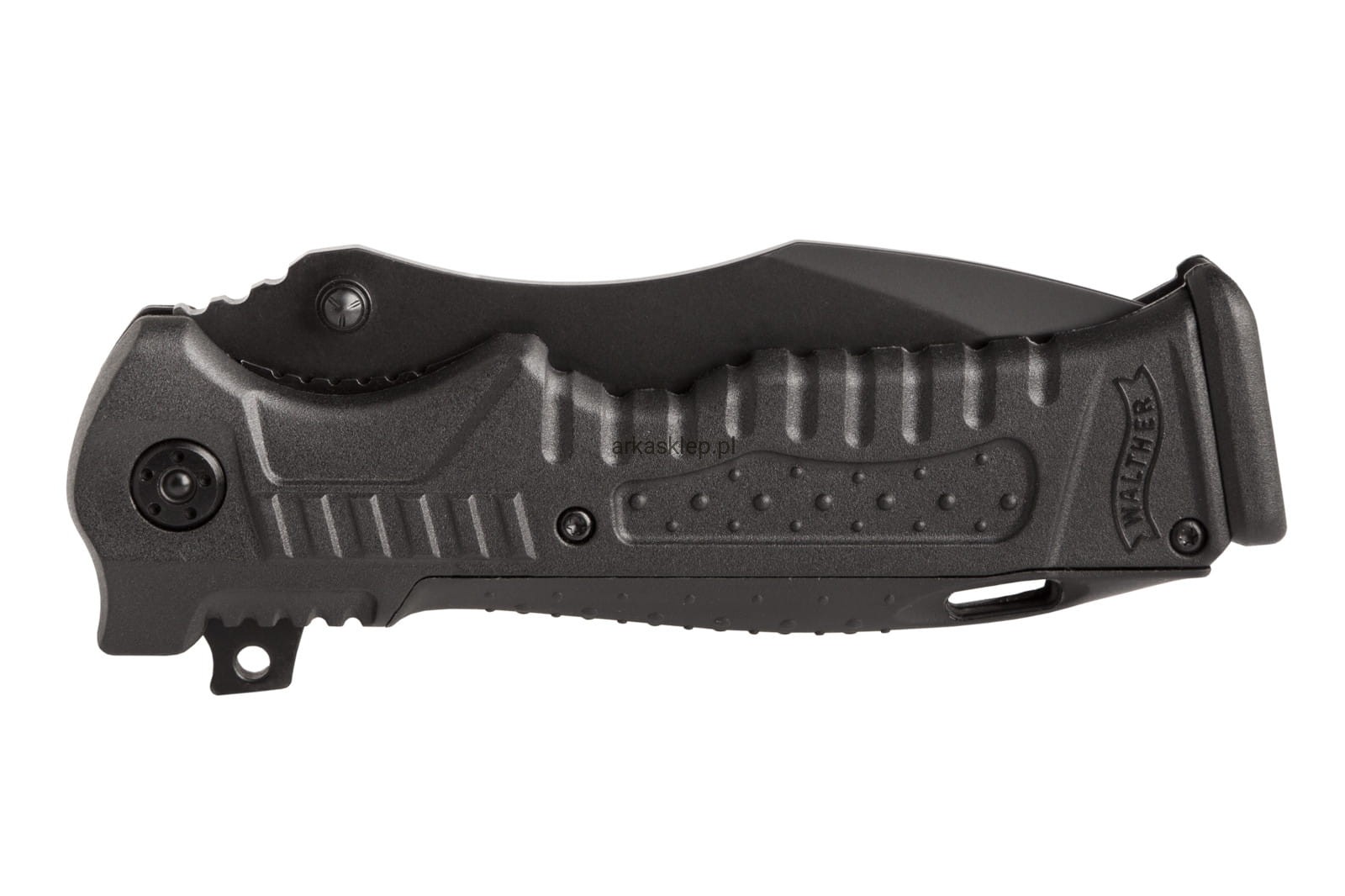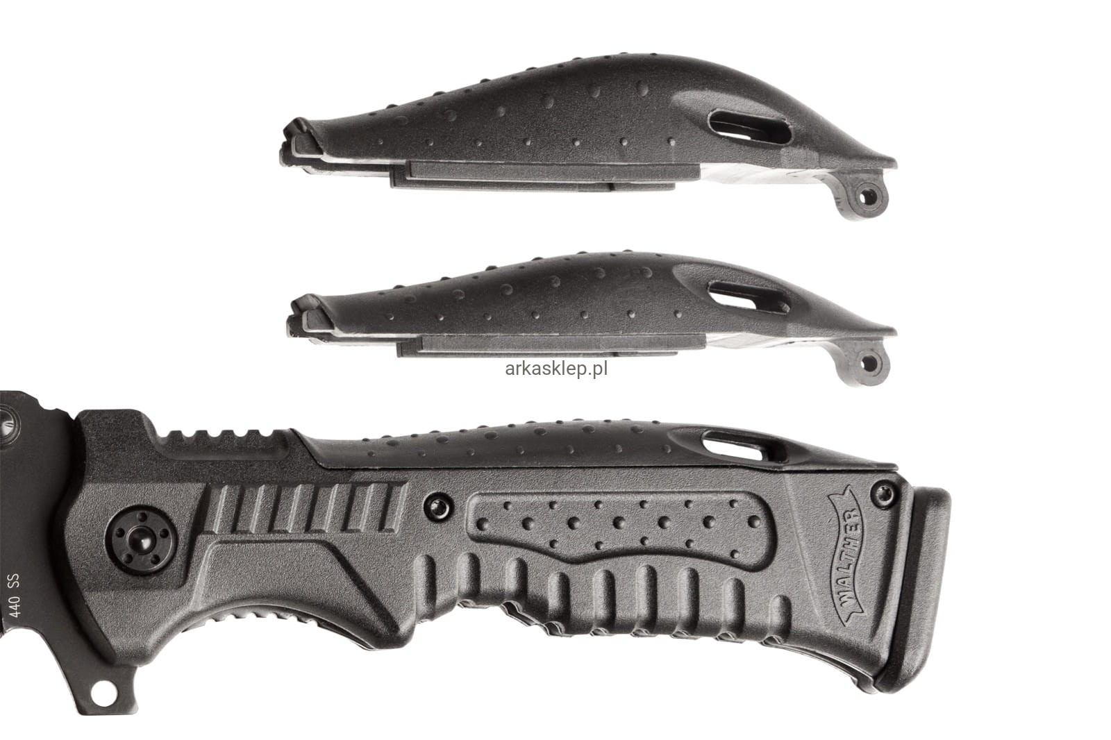 Rękojeść to jeden z najważniejszych atutów tego modelu. Jej kształt został zaczerpnięty wprost z pistoletu Walther P99 – jednego z najpopularniejszych modeli broni palnej na świecie. Dzięki odpowiednio wyprofilowanym podcięciom pod palce nóż trzyma się wygodnie zarówno gołą dłonią jak i ubraną w rękawice.
