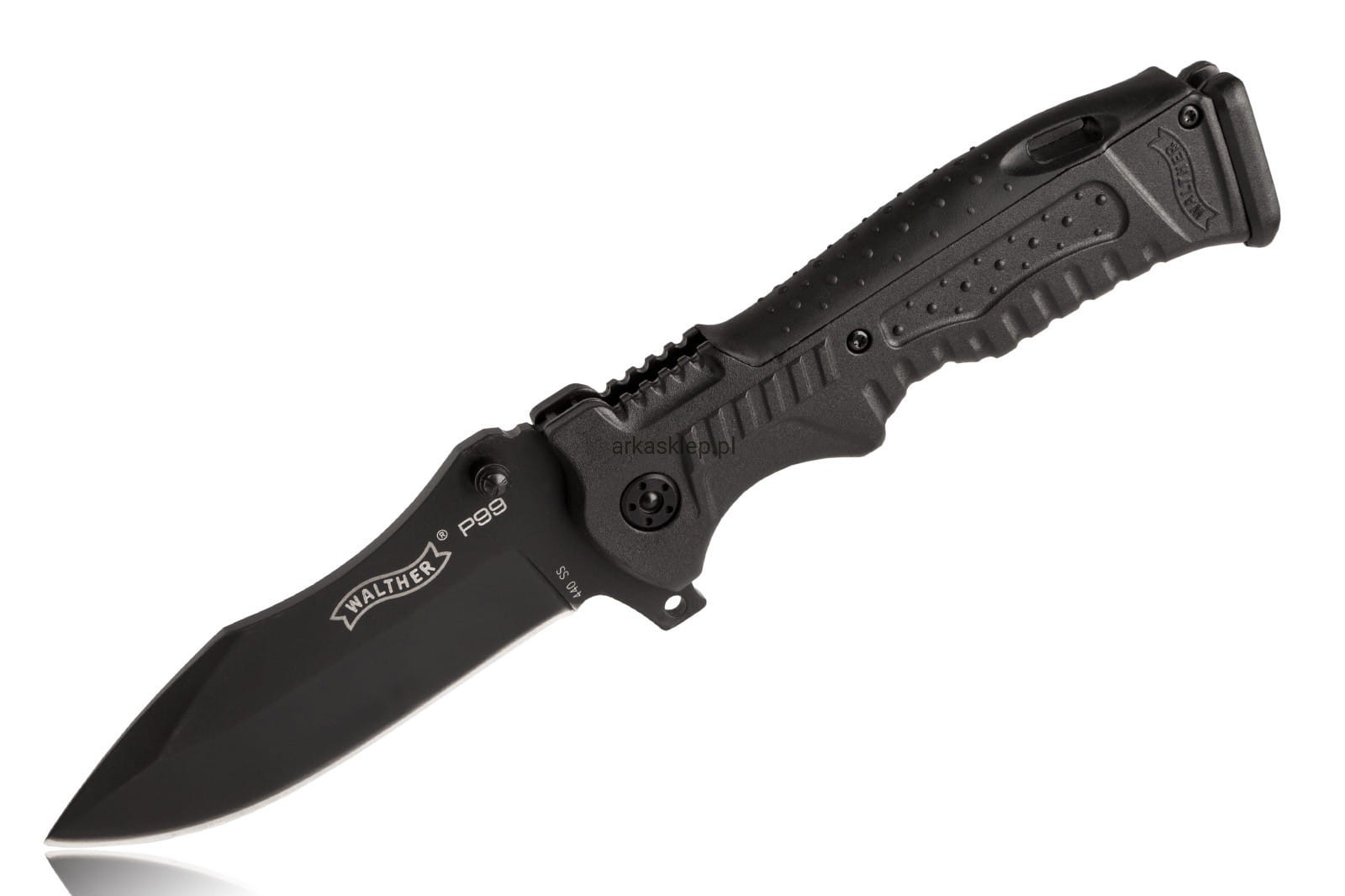 Głownia noża Walther P99 została wykonana z nierdzewnej stali typu 440, która w warunkach normalnego użytkowania gwarantuje dobre trzymanie ostrości roboczej oraz bezproblemowe ostrzenie na większości dostępnych na rynku ostrzałek. Producent wyposażył ten model noża w dwie możliwości otwarcia klingi. Pierwszą z nich jest flipper, który w pozycji zamkniętej znajduje się na grzbiecie rękojeści. Jego przyciśnięcie palcem wskazującym powoduje płynny ruch głowni, która dzięki wykorzystaniu siły odśrodkowej wędruje do pozycji otwartej. Wspomniany flipper w pozycji otwartej pełni jednocześnie funkcję jelca zabezpieczającego przed zsunięciem się dłoni na ostrze. Zastosowanie takiego rozwiązania powoduje, że Walther P99 to bezpieczny nóż. Drugi sposób otwarcia głowni to obustronny kołek. Dzięki takim rozwiązaniom nóż mogą obsługiwać zarówno osoby prawo jak i leworęczne.