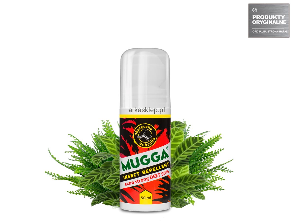 Oryginalny preparat na kleszcze i komary Mugga Rolka (roll-on) w formie płynnej do bezpośredniej aplikacji na odkryte części ciała, oparty na skutecznej notyfikowanej przez Unie Europejską substancji aktywnej DEET chroniącej ciało ludzkie przed różnego rodzaju groźnymi dla zdrowia insektami m.in.